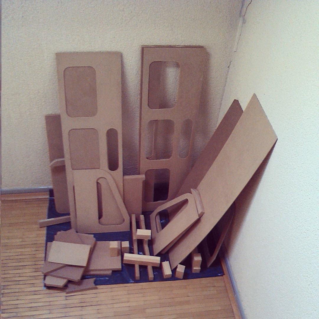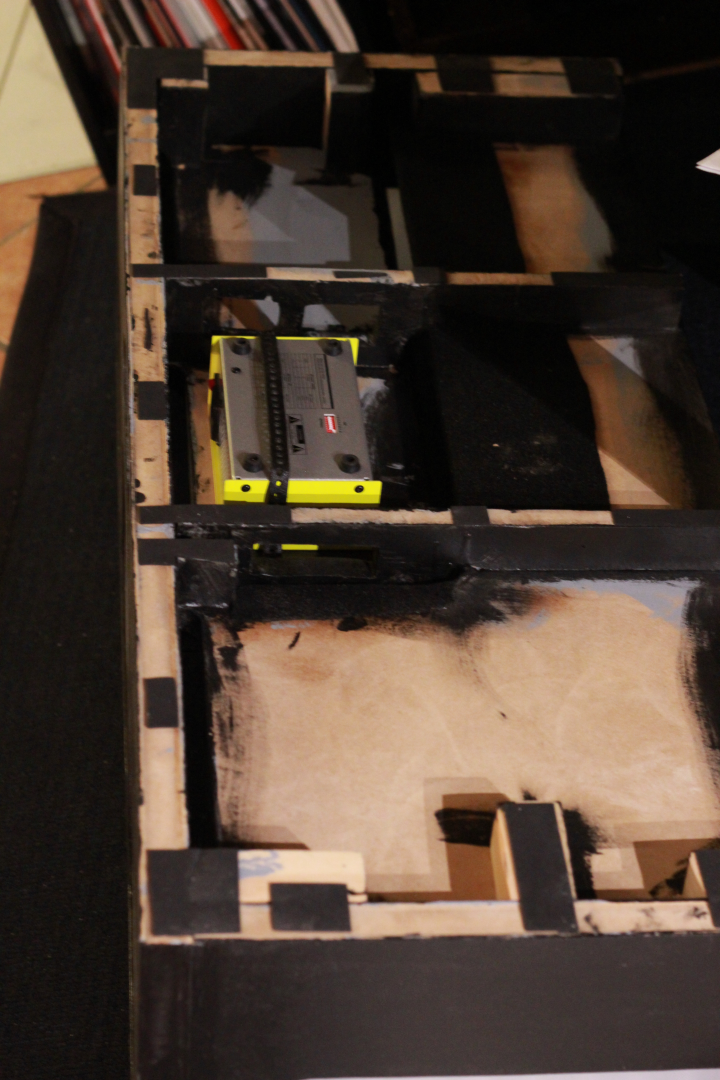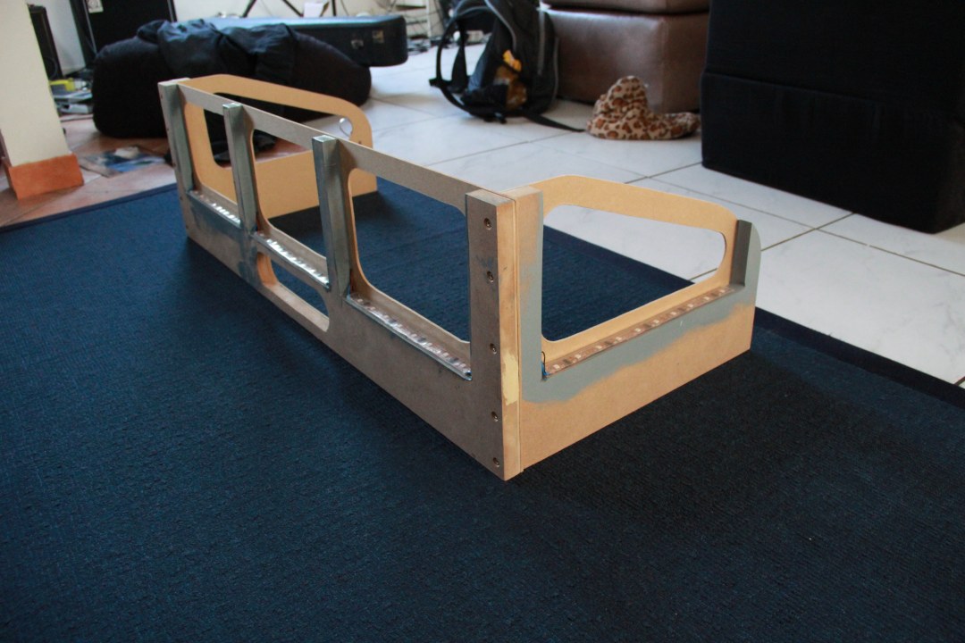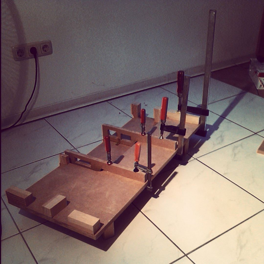 The wood I used to build the framing and the baseplate was medium density fiberboard. Only some of the feet are made of solid wood. The side panels consist of four layers. One 19mm plate in the middle as supporting structure and 2mm plates as sheathing. On one side an additional 2mm plate is attached to the supporting plate to make the gap a little bigger and to give room for the cables.